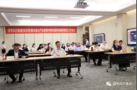 2020年7月27日上午,越秀风行食品在国贸大厦13楼会议室召开2020年度全面从严治党暨中期党建党风廉政建设工作会议。越秀风行食品及下属企业领导班子成员、本部中层以上管理人员及全体党员、各下属企业党、纪、工、团、人力资源部门负责人、各基层党组织负责人、受表彰的“两优一先”以及公司入党积极分子,共148人参加会议。越秀集团党委工作部、综合室和纪检监察室相关领导到会指导,会议由越秀风行食品临时党委副书记常芳主持。