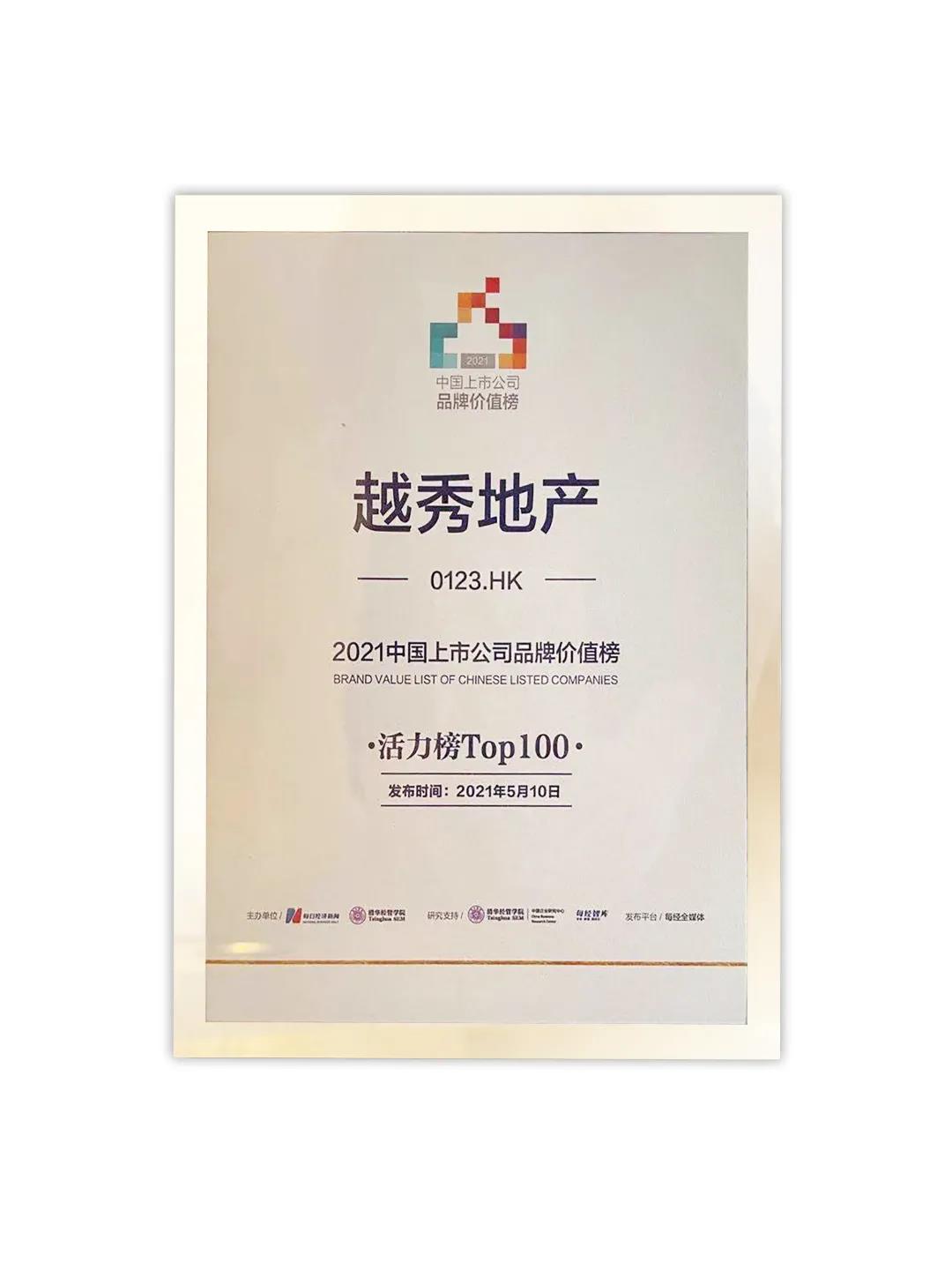 “中国上市公司品牌活力榜”为首次推出。榜单根据上市公司2021年品牌价值增长率,对2021年品牌价值大于200亿元人民币的中国上市公司依降序方式进行排序而成,旨在表彰在2020年品牌建设中表现优异的中国上市公司。越秀地产以211亿元的品牌价值及50.8%的品牌价值增长率,荣登活力榜Top100第25位。