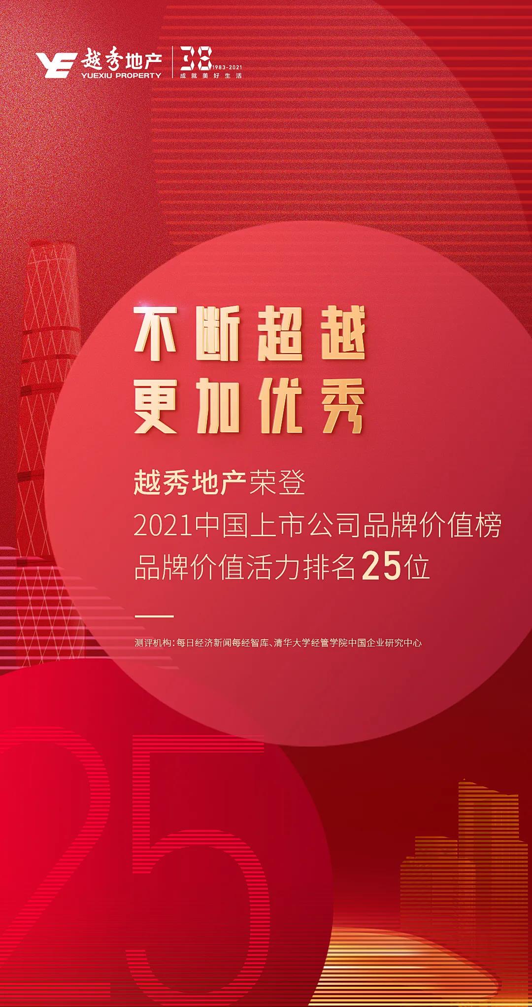 5月10日是第五个中国品牌日,在每日经济新闻联合清华大学经济管理学院举办“2021中国上市公司品牌价值榜发布会”上,越秀地产凭借近年来突出的企业品牌价值成长性,特别是疫情期间的企业增长活力,荣登“2021中国上市公司品牌活力榜Top100”第25位。