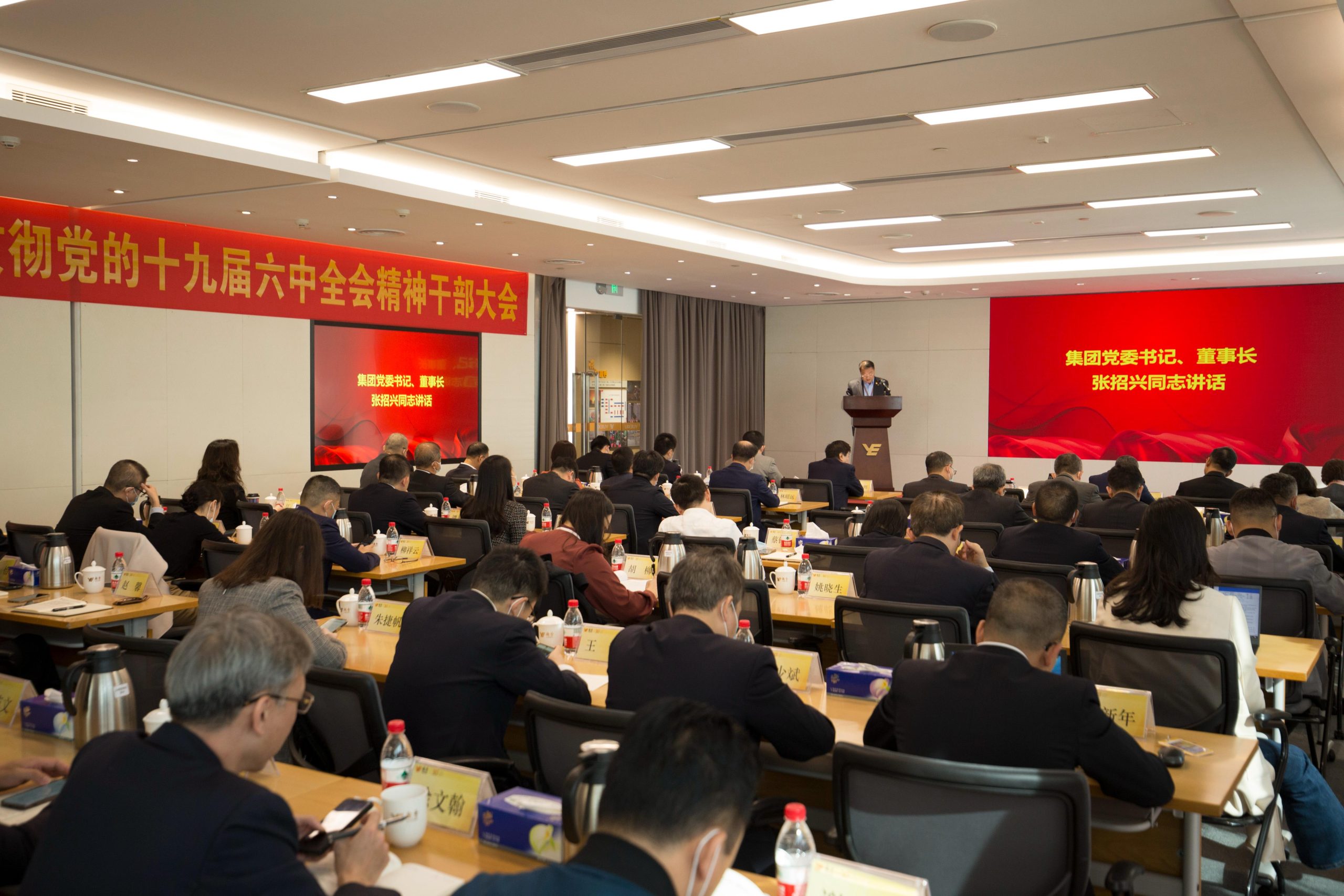 2021年11月24日,越秀集团召开传达学习贯彻党的十九届六中全会精神干部大会,集团党委书记、董事长张招兴作讲话,集团党委副书记、董事伍尚辉主持。会议采取“视频会议+直播”方式召开,共设立主分会场49个,参加会议的包括三级党政班子成员及至各党支部支委成员和相关政工部门负责人共1285人。集团广大党员、入党积极分子、各级(非现场参会)人才培养项目的学员、共青团员等通过领秀直播视频参加会议。